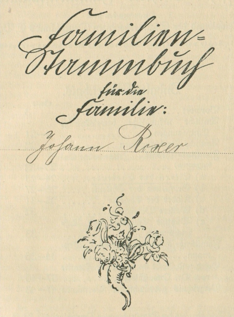 Vorheriges BildNächstes Bild Familienbuch_Johann_Roxer_Vorderseite_V2 Familien-Stammbuch Johann Roxer, erste Innenseite