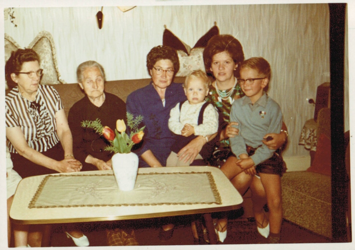Vorheriges BildNächstes Bild Uroma Johanna, Oma Erna, Gerda, Lutz, Matthias, NN. NN, Uroma Johanna Matzkus, Oma Erna Roxer, Matthias, Gerda und Lutz Roxer